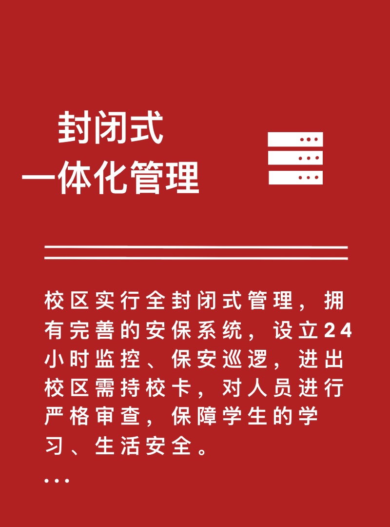 学校采取全封闭式教学 ,校区教学氛围浓厚, 交通便利,环境优美。